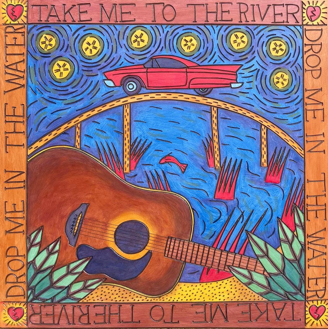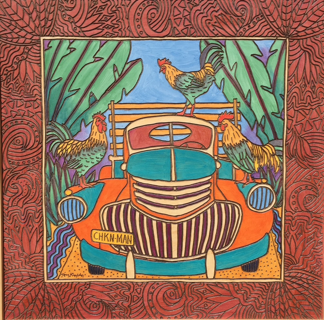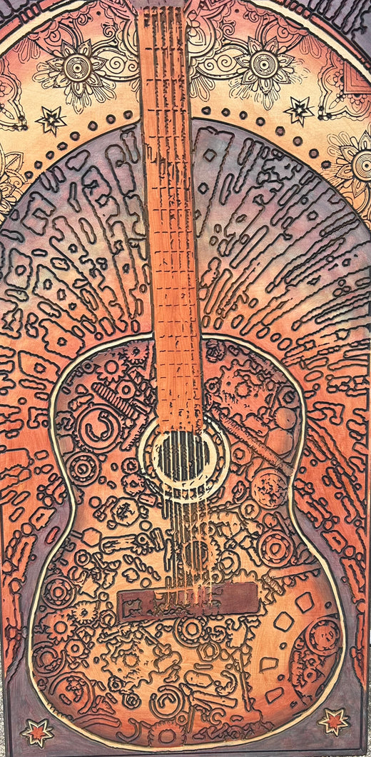 The imagery in these pieces are engraved into hardboard panels and painted with layers of transparent acrylic glazes, They are sealed with polyurethane clear coat and framed in maple. Ready To hang . These pieces may take additional time to finish and ship. Contact me for specific pieces.
